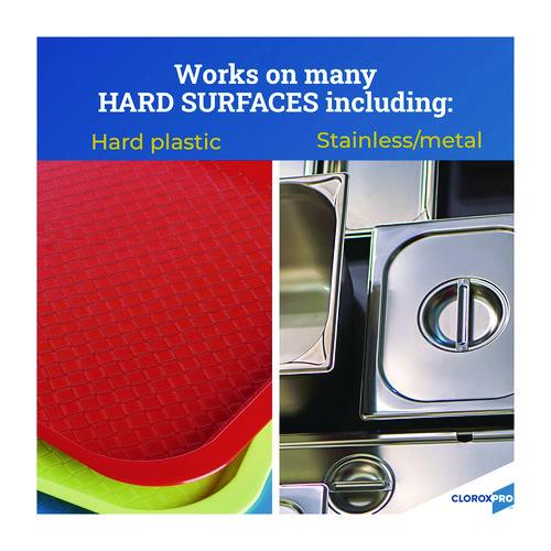 CloroxPro Anywhere Hard Surface Sanitizing Cleaner is designed for use with sprayer devices, including the Clorox Turbo Sprayer Device, to provide full coverage, one-step sanitization of hard surfaces. Certified by NSF, CloroxPro Anywhere Daily Disinfectant and sanitizer kills cold and flu viruses and 99.9% of bacteriaincluding Coronavirus (on hard nonporous surfaces when used as directed) and Influenzawith a spray that's pH-balanced. As a hypochlorous acid based formula, the cleaner is tough on bacteria yet mild enough to use around kids, pets and food, thanks to its low odor and no residue. This sanitizing spray is well suited for commercial spaces and intended for use in airports, public restrooms, day care centers, kennels, laundry rooms, offices and schools. The versatile pH-balanced formula can be used on most surfaces anytime, anywhere. Application: Disinfectant/Sanitizer; Applicable Material: Cement/Concrete; Ceramics; Enamel; Fiberglass; Glass; Grout; Laminates; Metal; Plastic; Sealed/Engineered Stone; Vinyl; Wood; Dirt Types: Bacteria; Fungus; Germs; Mildew; Mold; Scent: Unscented.