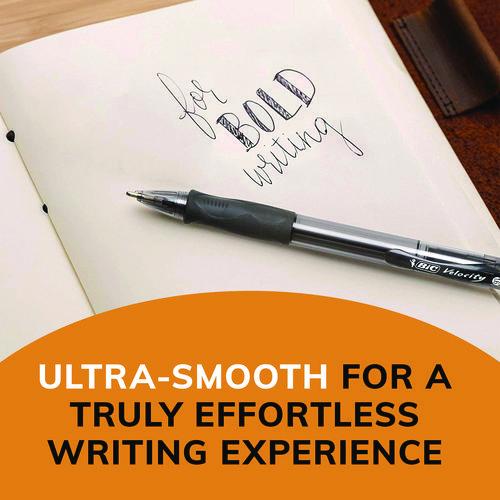 Be bold with the GLIDE Bold Retractable Ball Pen. Vivid and ultra-smooth, this pen features BIC's smoothest writing system yet, even smoother than BIC's classic paste-ink system. A 1.6 mm precision tip and classic ballpoint design ensure excellent line quality and solid, reliable performance. A comfortable rubber grip and a convenient, plastic pocket clip deliver easy writing while allowing you to keep the pen with you wherever you go. Smooth-click, retractable pen mechanism. Value Pack—Stock up and save! Pen Sub-Brand & Product Family: GLIDE Bold; Pen Type: Ballpoint Pen; Pen Style: Retractable; Pen Tip Type: Conical.