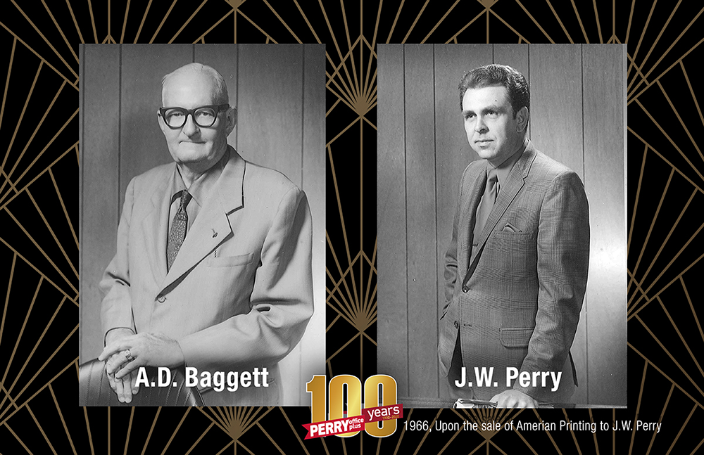 In 1962, J.W. Perry saw an ad for Miller Printing in the Dallas newspaper and purchased the company. With only one employee – Harrison Legan – and no printing jobs, Perry and his wife Ruth built up the business. After a few successful years, in November 1966, Perry closed Miller Printing and purchased American Printing from Baggett.