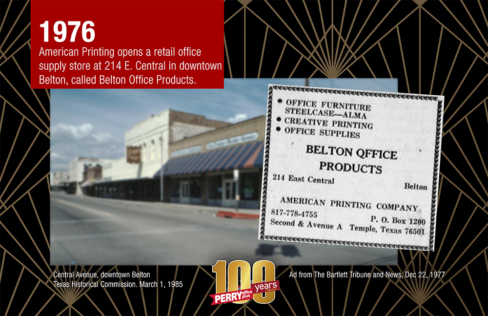 In 1976, American Printing expanded by opening an office on Central Street in Belton, called Belton Office Products. In 1983, Perry divided the printing and office products businesses and the Belton store was named Perry Office Products.